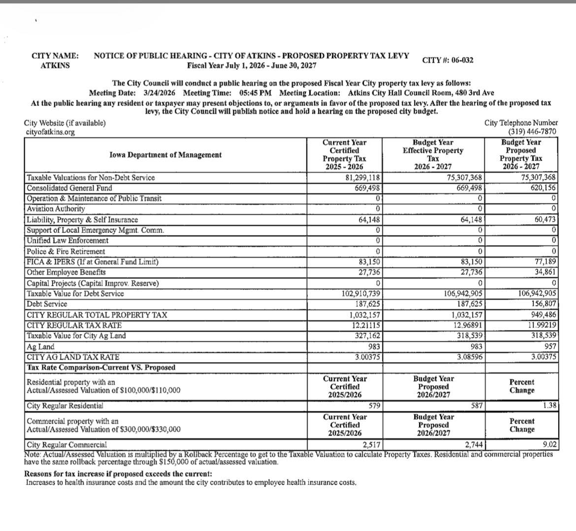 The City Council will hold a public hearing on the proposed Fiscal Year 2027 property tax levy on Tuesday, March 24, 2026, at 5:45 pm at City Hall (480 3rd Ave) during a special City Council meeting.